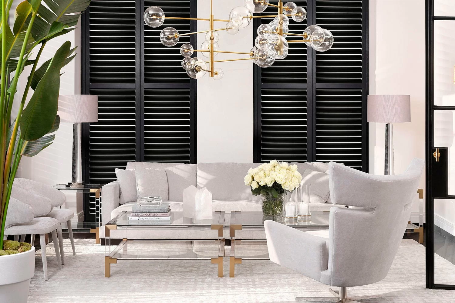 For styling your Ruby chandelier, take inspiration from Eichholtz’s Modern Comfort room design. Utilise clean lines and contrasting colours, keeping the room’s décor luxurious yet minimalistic. In doing this, your chandelier will have an opportunity to sing from its hanging spot, and be the centre of attention in your space. To go the extra mile, add accessory pieces throughout your room with accents of antique brass, to elegantly tie in with the chandelier.