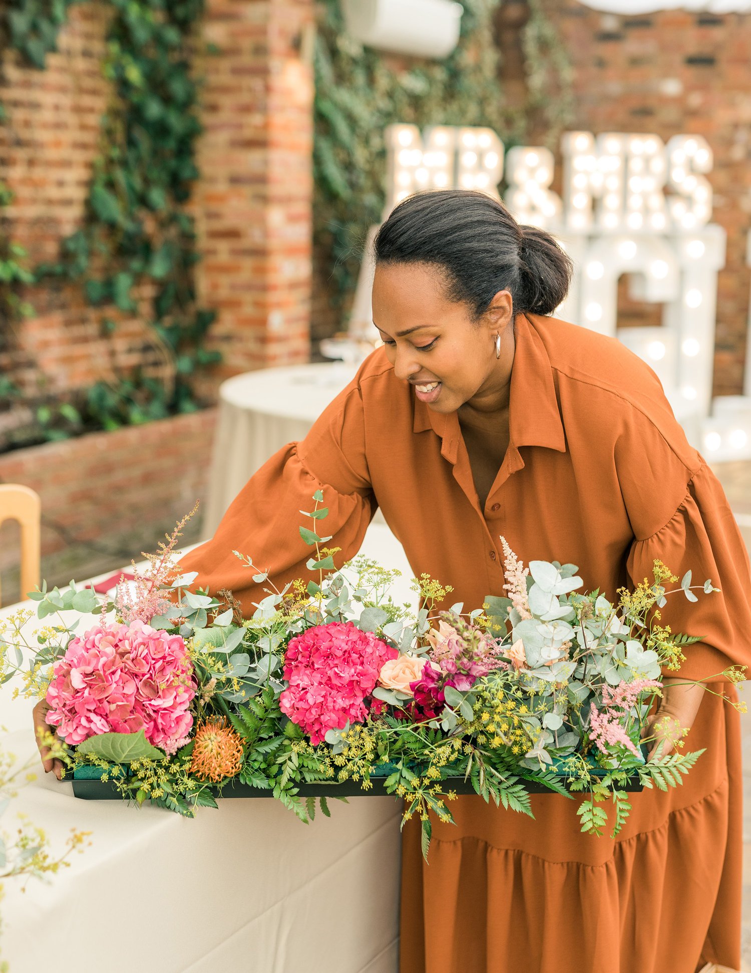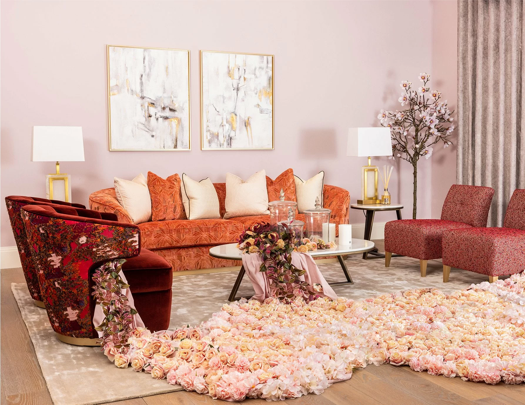 We paired bold and soft colours together to create a harmonious feel to the collection. Incorporating subtle prints on the fabric with more bolder textures to allow more depth. To tie together this beautifully curated piece we put in place a bed of roses picking out highlighted colours which was created by the talented Queen of Hearts. Possessing knowledgeable experience of interior designing of over 11 years, Queen of Hearts Floral Design has careful attention to detail with her interior décor elements such as her take on colour, texture, and the shapes when she considers her floral compositions. Creating memorable and lavish displays with her creative flair, she breathes creativity in creating all her clients’ floral dreams.
