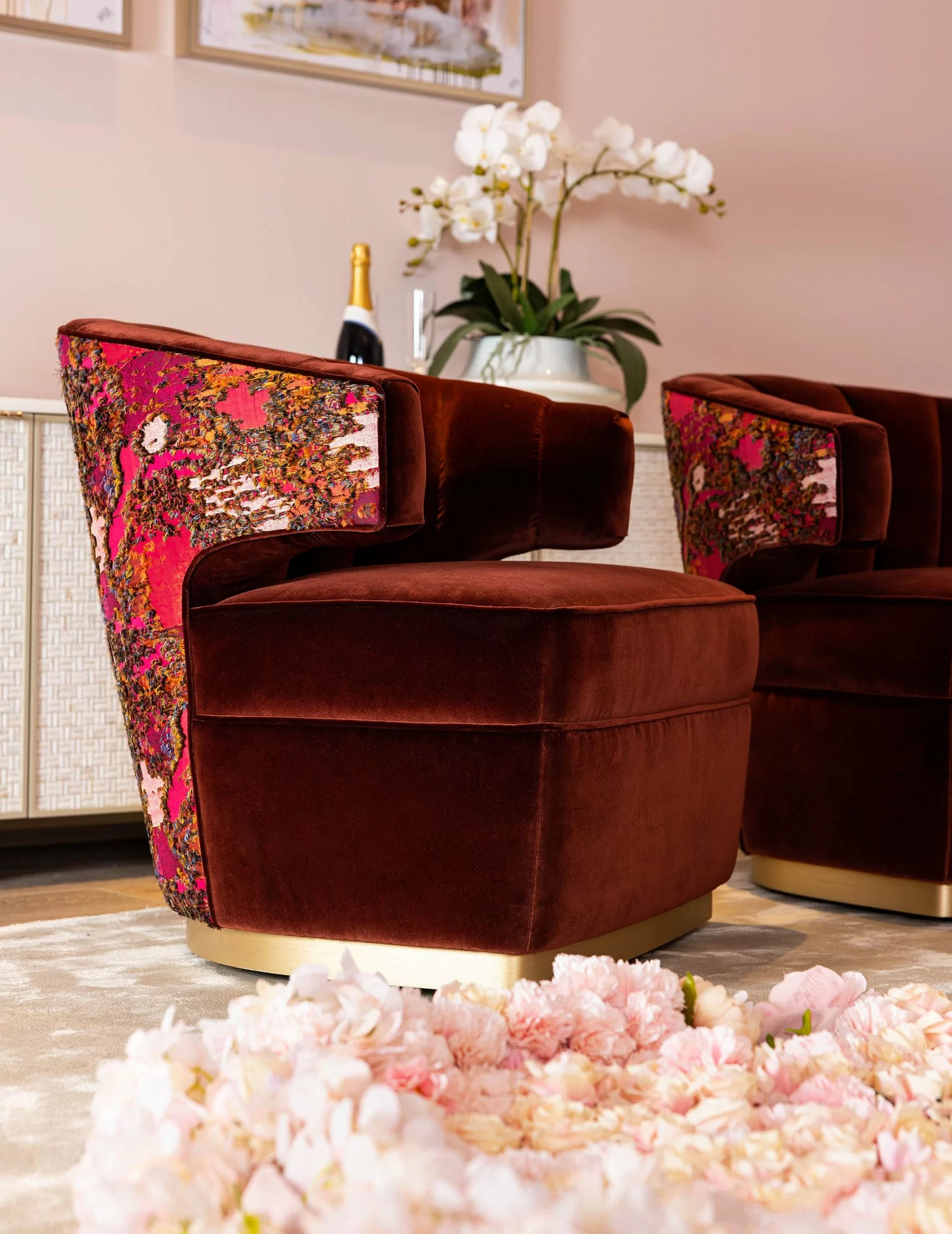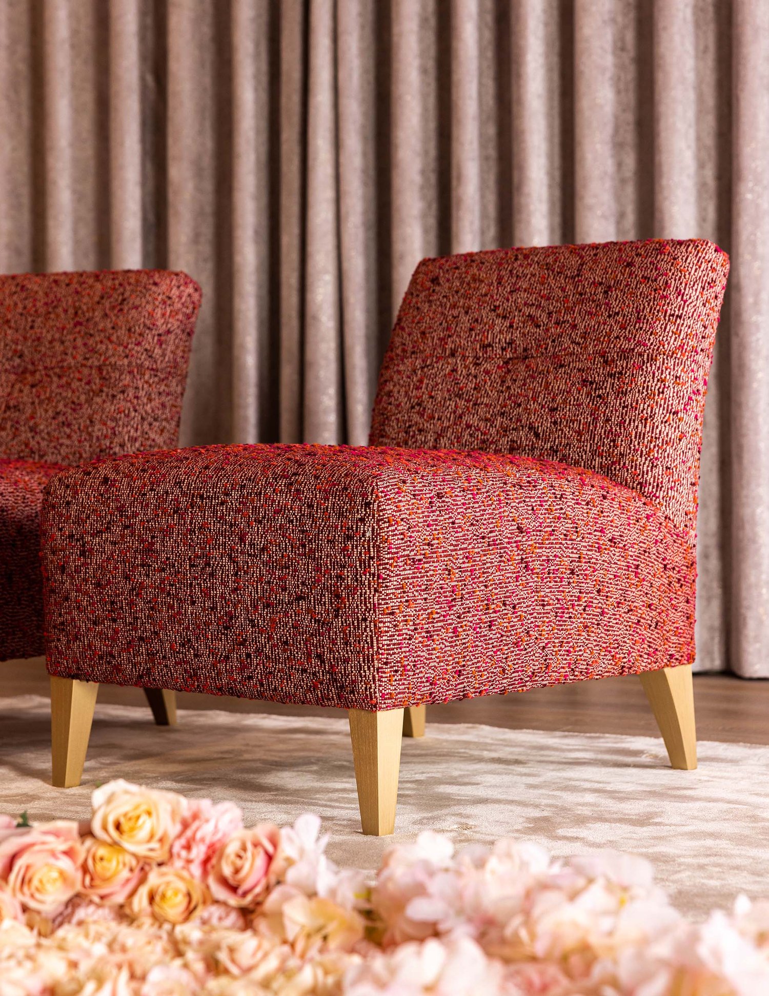 Nobilis exhibits a lot of depth and texture in their fabrics like the display in the Chelsea Flower Show. Texture is often amplified when it is paired with more subtle designs and that is what we have created to honour the Chelsea flower week. Combining these two elements created the story behind our take on showcasing flowers with textured fabric upholstered on our famous furniture.
