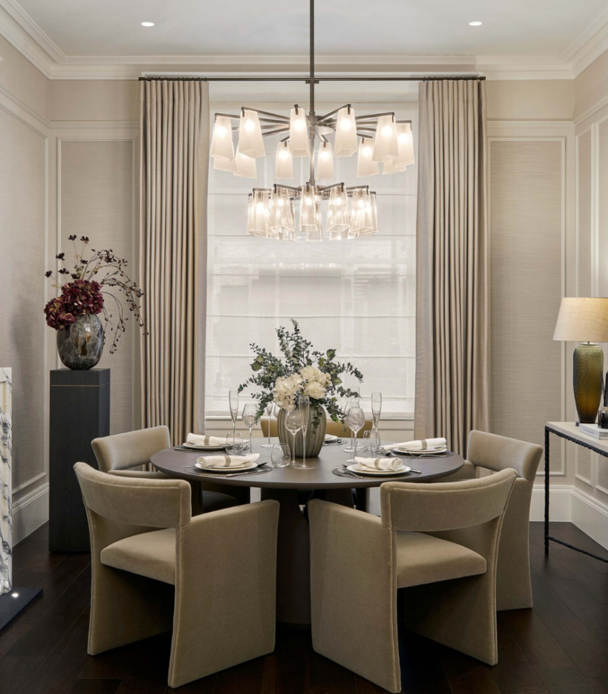 Lighting is an essential element in any luxury dining room, creating ambiance and accentuating the room’s finest features. A stunning chandelier above the dining table serves as both a functional light source and a defining design feature. Whether it’s a grand, crystal chandelier or a sleek, modern fixture with metallic accents, the right choice will illuminate the space while adding a layer of refinement.