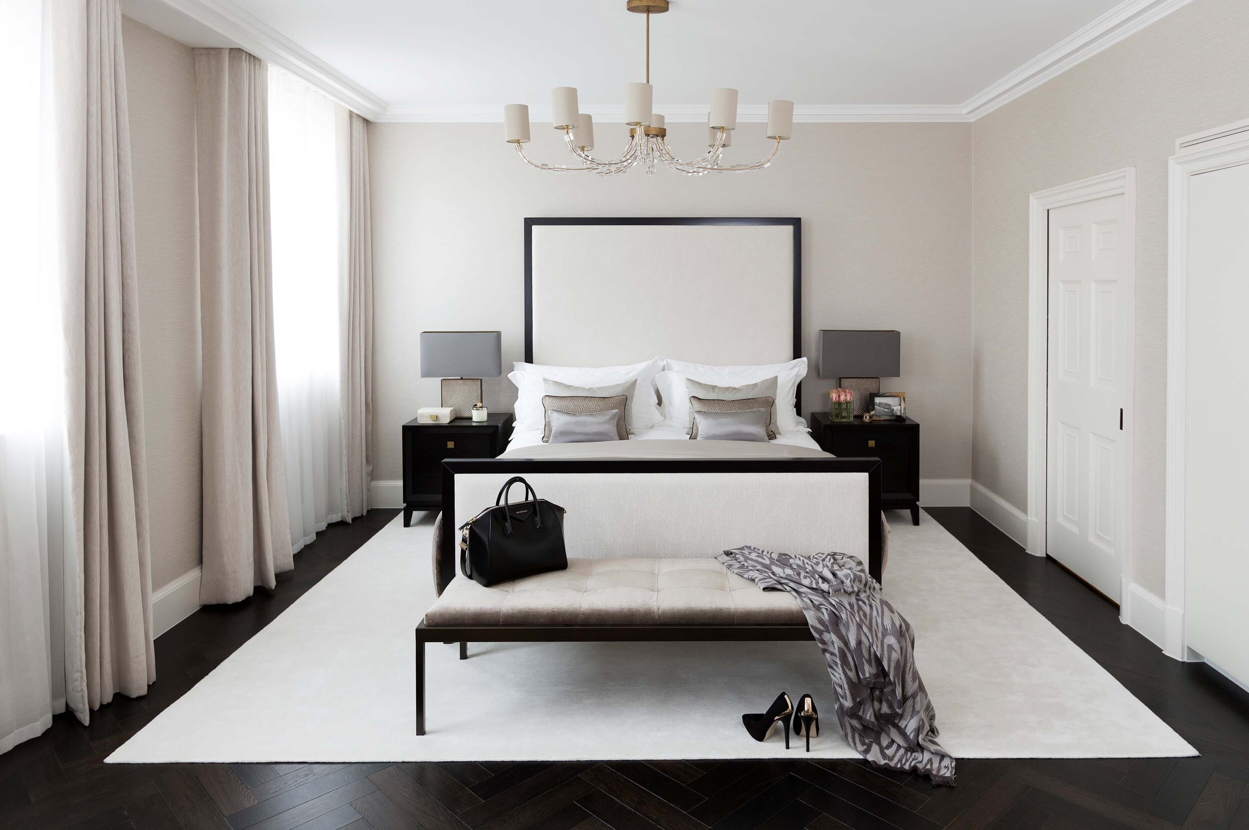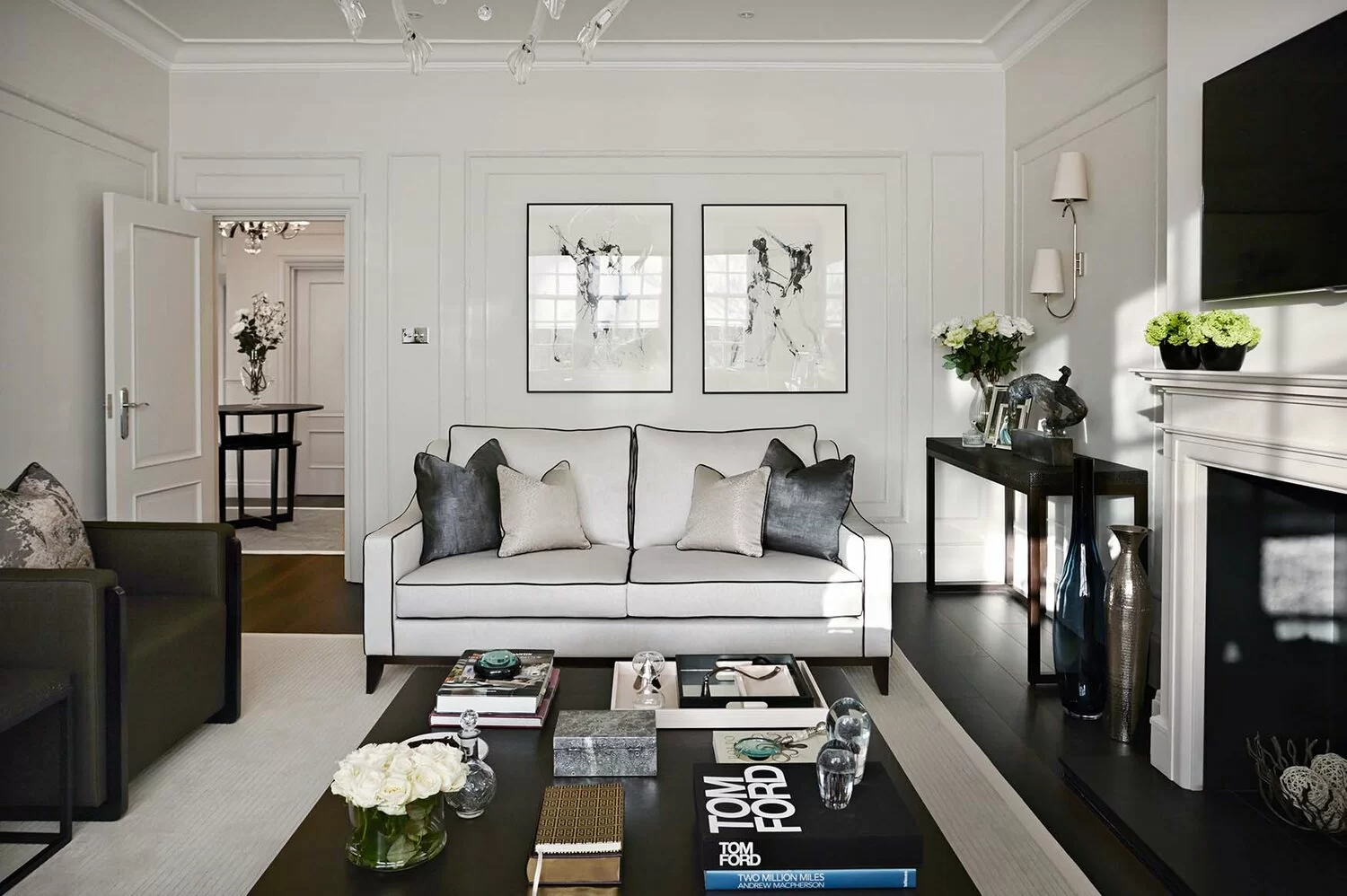 The trick is in the ratio of light to dark. If you want the room to be timeless then it’s wise to stick to cream or white walls, with subtle touches of black on linear design details such as furniture frames or feet, and flooring.