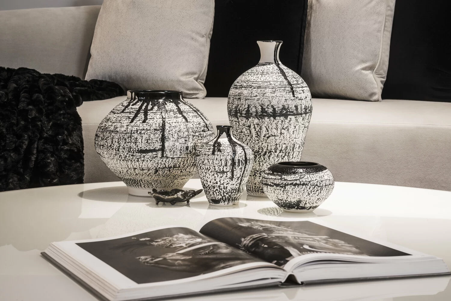 Last but by no means least, don’t forget to accessorise. Curate an edited selection of black, white and metallic accessories on a monochrome coffee table, honing in where possible on ceramics and objects which bring a touch of modernity to your monochrome decorating scheme. Explore and shop from a selection of vases, which have been selected specifically to work both as standalone display items, and group together en masse for maximum impact! Whether you choose to follow the style cues of Syrie Muagham or a more contemporary and modern vibe, rest assured your monochrome colour palette will remain in-vogue.
