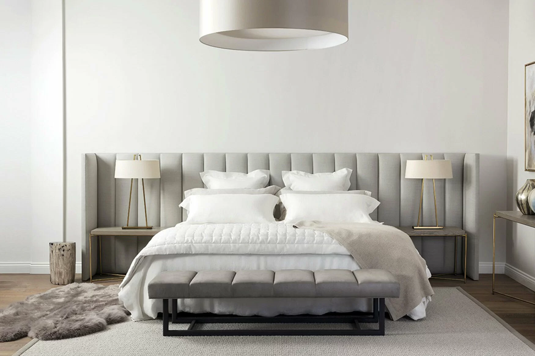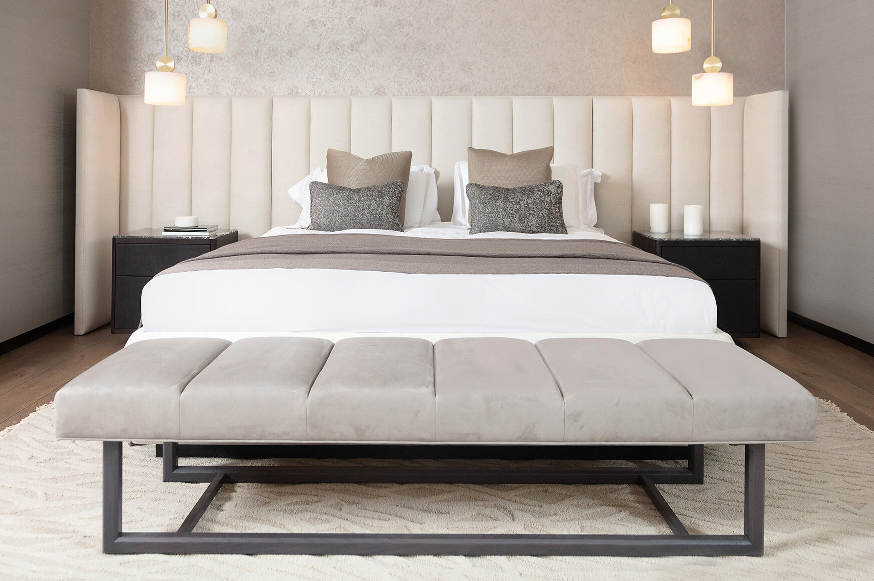 The monochromatic bedroom in this Chester Terrace home (above) is an example of masterfully curated monochromatic interior design. The walls and curtains ooze warmth, creating a comfortable feeling, whilst black is applied only to the floor - grounding the room - and as a show wood design detail framing the Edgware upholstered bed. The addition of two high-shine, lacquered bedside tables, such as the Nino Bedside, completes a glamorous monochrome bedroom scheme.